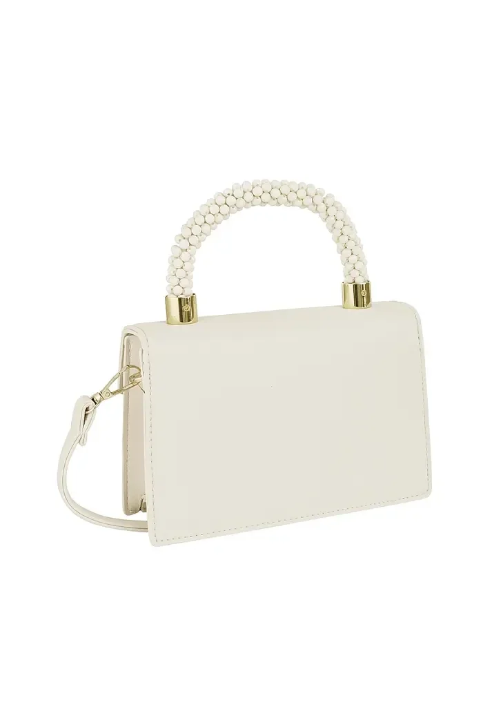 Beige envelop tas met een funky snoepachtige handvat en een lang hengsel.