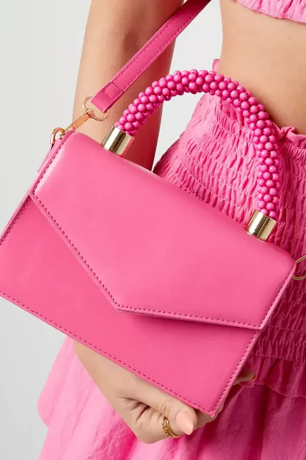 Roze envelop tas met een funky snoepachtige handvat en een lang hengsel.